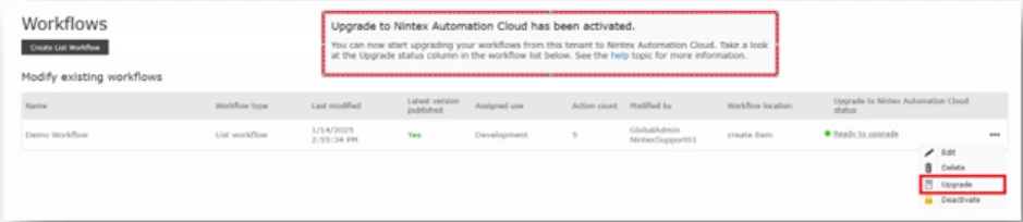At this point, your tooling should be activated on the site for the workflow upgrade. To verify this, you can check that the “Upgrade to Nintex Automation Cloud has been activated” banner is present when viewing the workflow inventory. If not, refer to the article above to activate the tooling for the site.