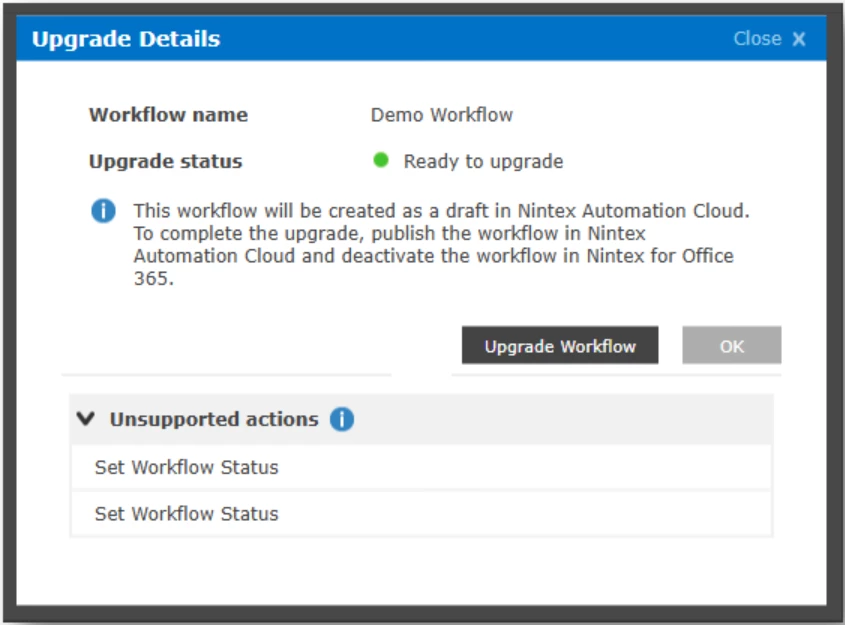 This will pop up a window with the upgrade details. The details include the option to upgrade along with general information about the workflow to be upgraded such as unsupported actions. To start the upgrade, click the Upgrade Workflow button.