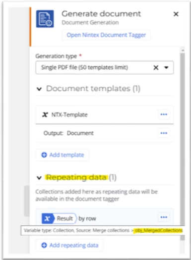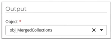 We will create an object as the output at the end of the Merge collections action to store the merged collections that we will then use in the Generate document action’s document tagger:
