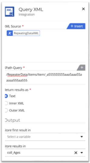 Drag on a Query XML action for each set of data you want to add to a collection for use in the document. The configuration may look like this depending on how the XML is stored/built up in SharePoint. In this case, ReapeatingDataXML is the column storing the XML in SharePoint: