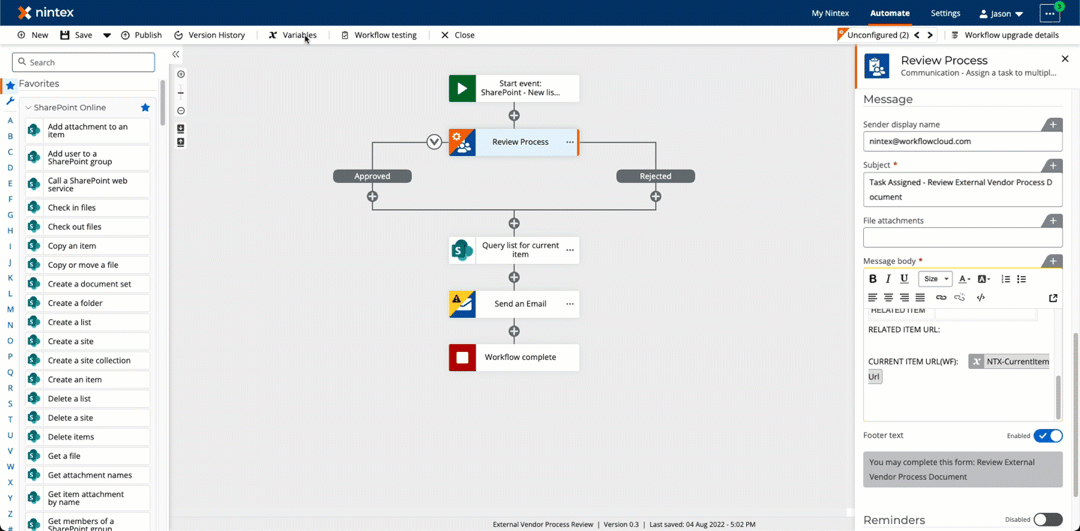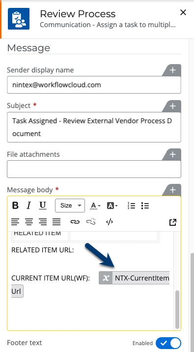 - In this example, the variable, NTX-CurrentItemURL, is a placeholder variable created by the upgrade tool. It is used in the Assign a task to multiple users email action's message body, but needs to be resolved.