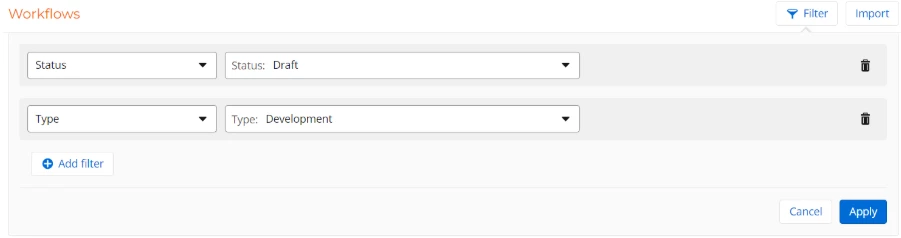 As the number of workflows increases, it can be challenging to find a specific one. Rather than scrolling through a long list, filters allow you to quickly narrow down the results by applying relevant criteria. This is particularly useful for organizations that have multiple departments or ongoing projects.